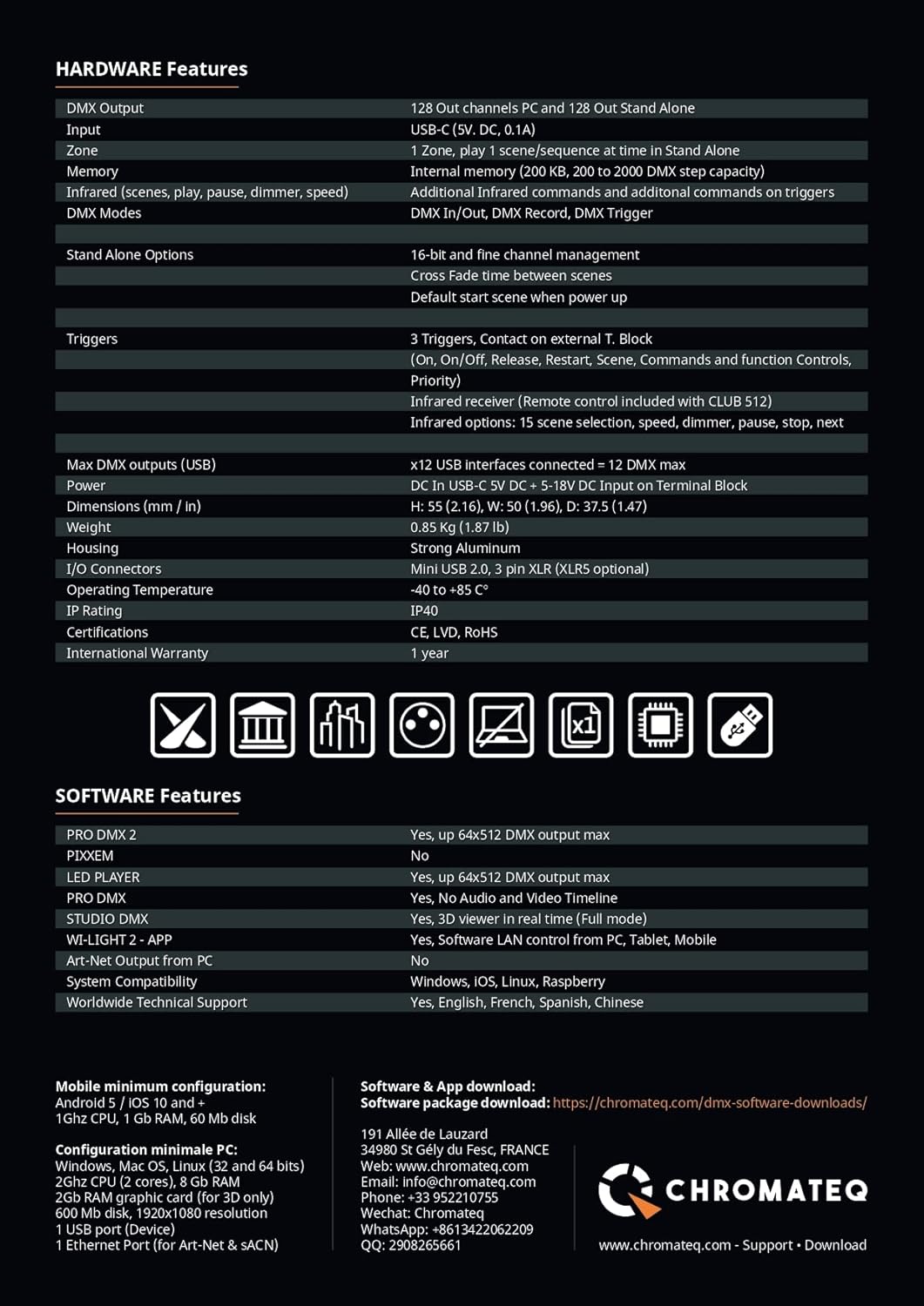 | Supported Software | Chromateq 2022 software: Yes / LED PLAYER: 128 DMX Output / PRO DMX: Yes, No Audio and Video Timeline / STUDIO DMX: 3D viewer in real time (Full mode) / WI-LIGHT 2-Mobile APP: Software control from mobile and LAN / Art-Net / sACN in/Out: No / World Wide Technical Support |